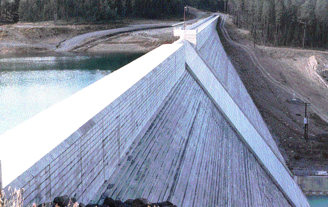 The project involved constructing a new RCC dam for pumped, off-channel, municipal water storage. Other features of the project included clearing the heavily timbered reservoir and dam site; excavating the dam and future treatment plant; quarried aggregate processing; multilevel intake, outlet works, and a smooth faced ogee weir spillway and related appurtenances.