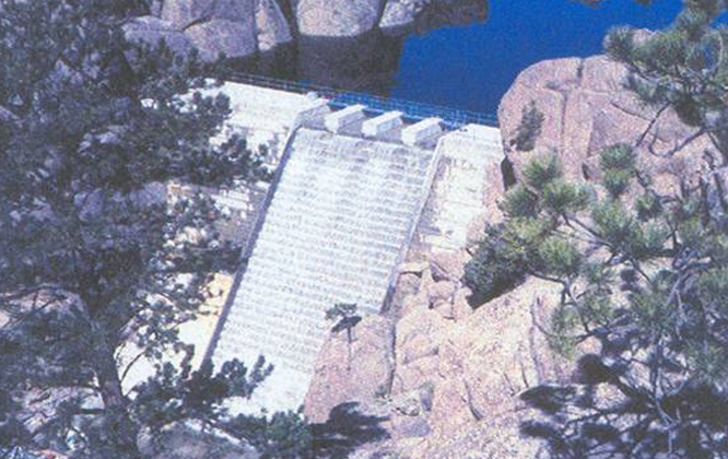 Construction of new RCC dam with vertical upstream face and 2 stepped downstream face, conventionally formed, cast-in-place concrete. Horizontal waterstop was placed in the upstream face cold joints. The project included 2,000 cy conventional concrete, two 24" steel outlet pipes, and aggregate screened on-site. RCC was placed by conveyor to crane delivery, and bedding grout and conventional concrete were placed by crane delivery.