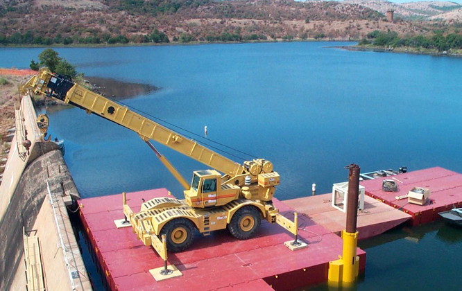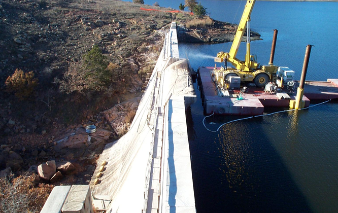 Modifications include wire saw cutting of between one and five feet of the existing top of the dam; installation of 43 post-tensioned anchors in large diameter percussion drilled holes; and replacement of 160 cy of concrete to the top of the dam. Installation of an upstream and downstream guard gate; construction of a 900 LF moisture cutoff wall; installation of a cured-in-place liner through the outlet works pipe; diver performed installation of upstream gate and repairs to upstream surfaces. All work at the dam accessed and staged from barges.